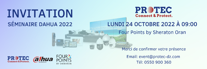 Nous avons l'honneur de vous convier au séminaire organisé par PROTEC et Dahua sur les nouvelles solutions et technologies de sécurité le 24 Octobre 2022.